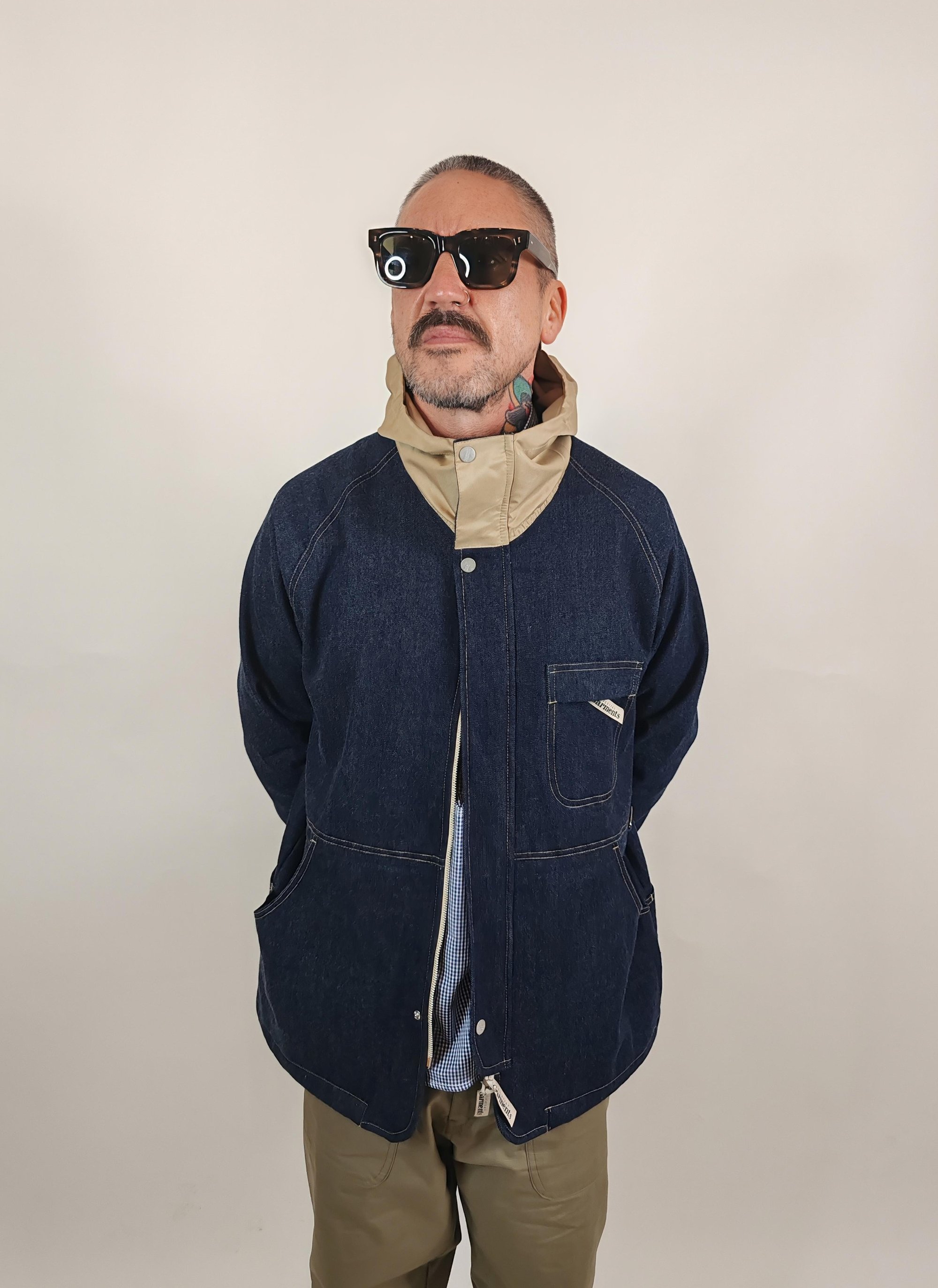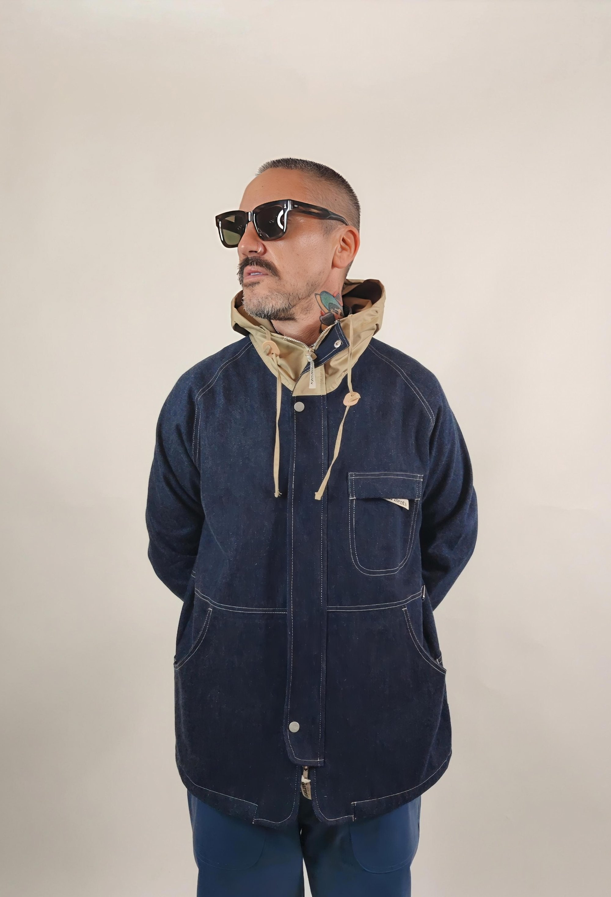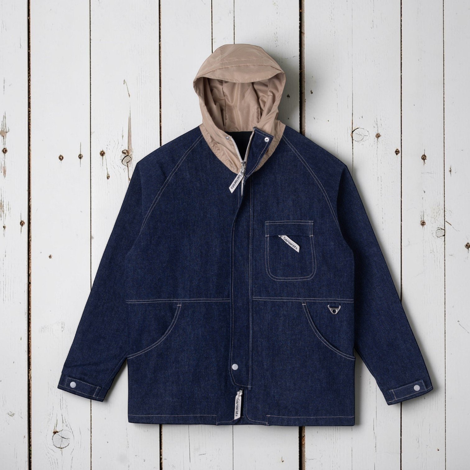 The overall appearance is both functional for the outdoors and stylish in a way that harkens back to traditional hunting fashion with a retro, denim-centric twist.