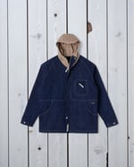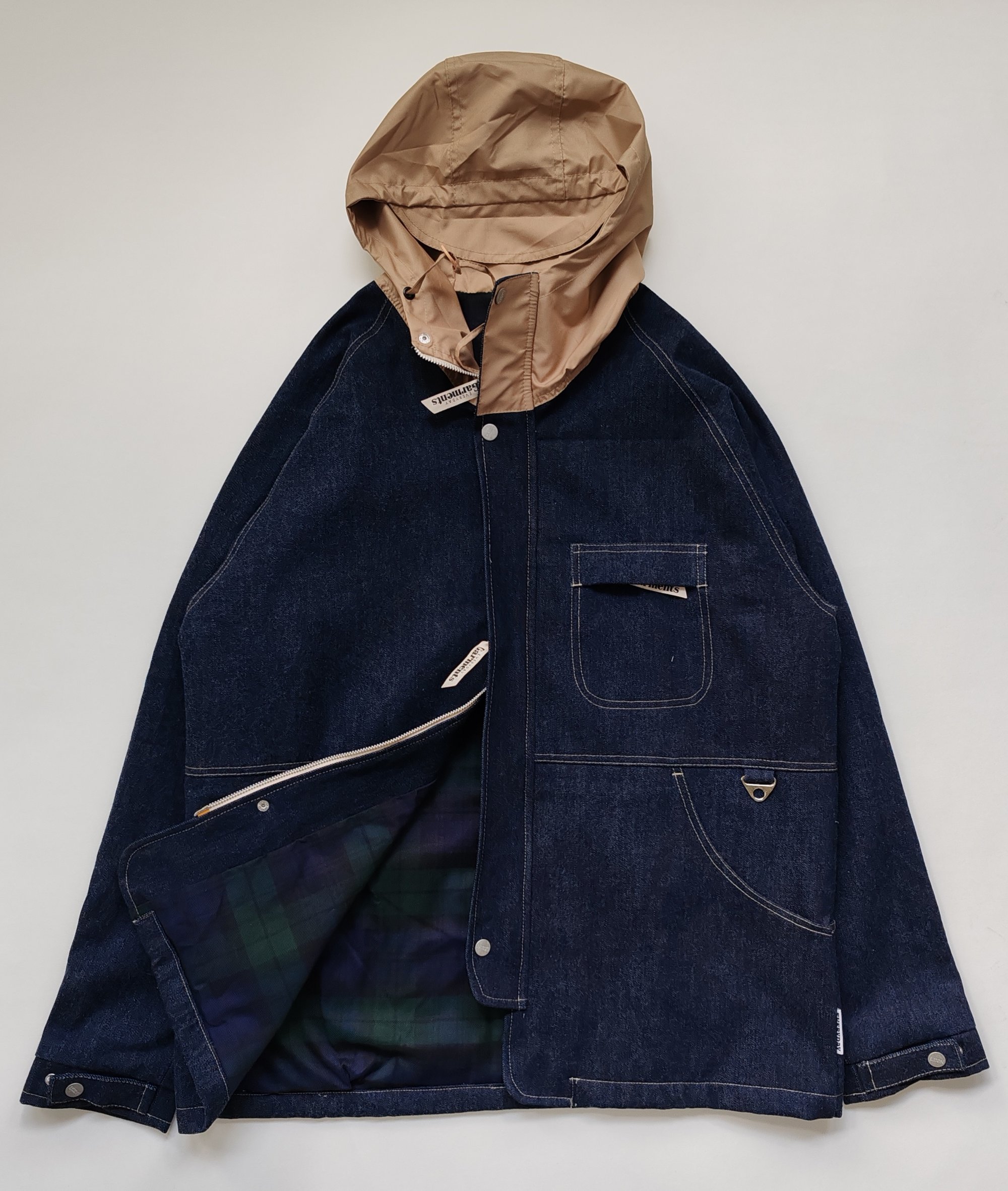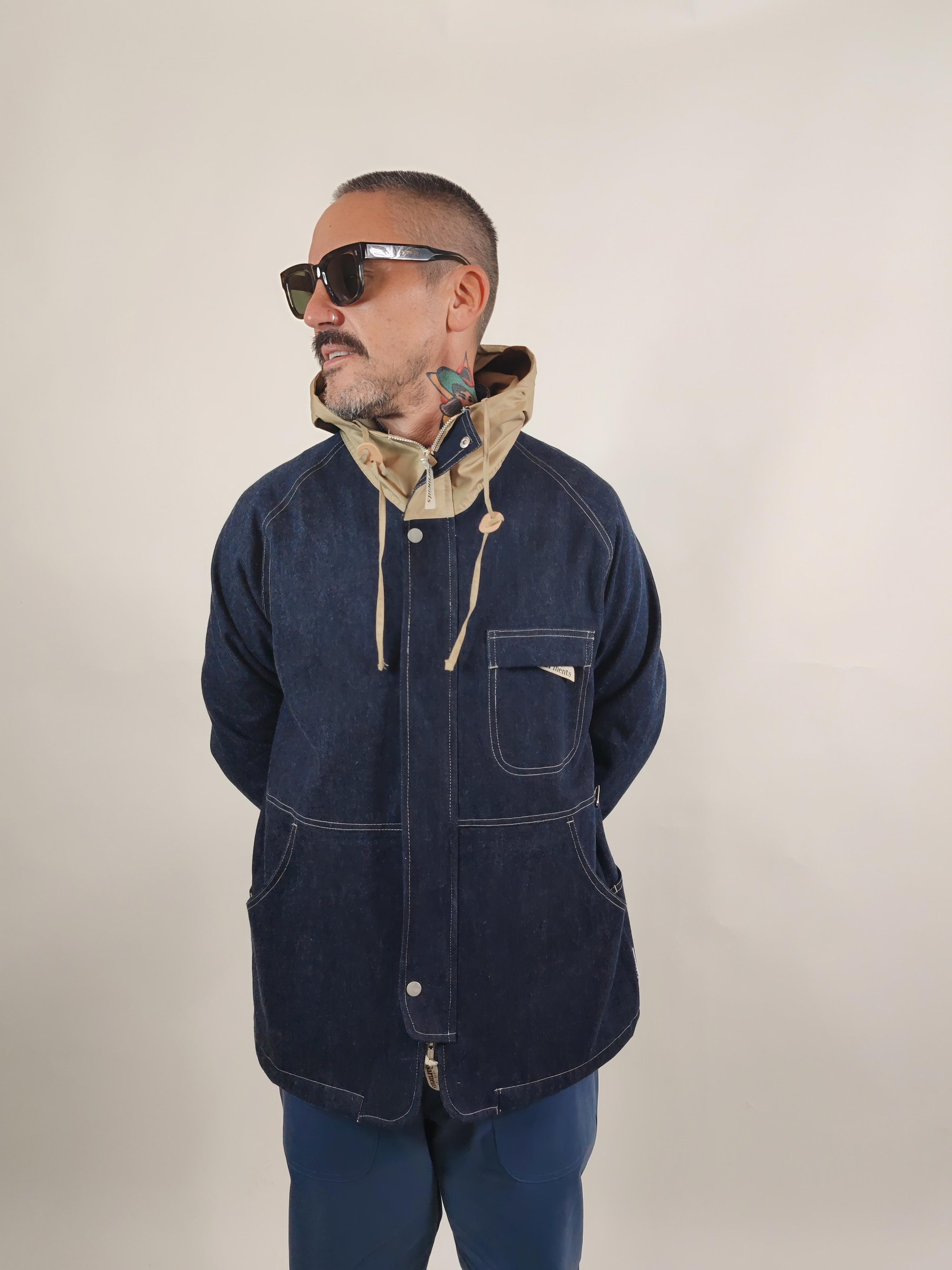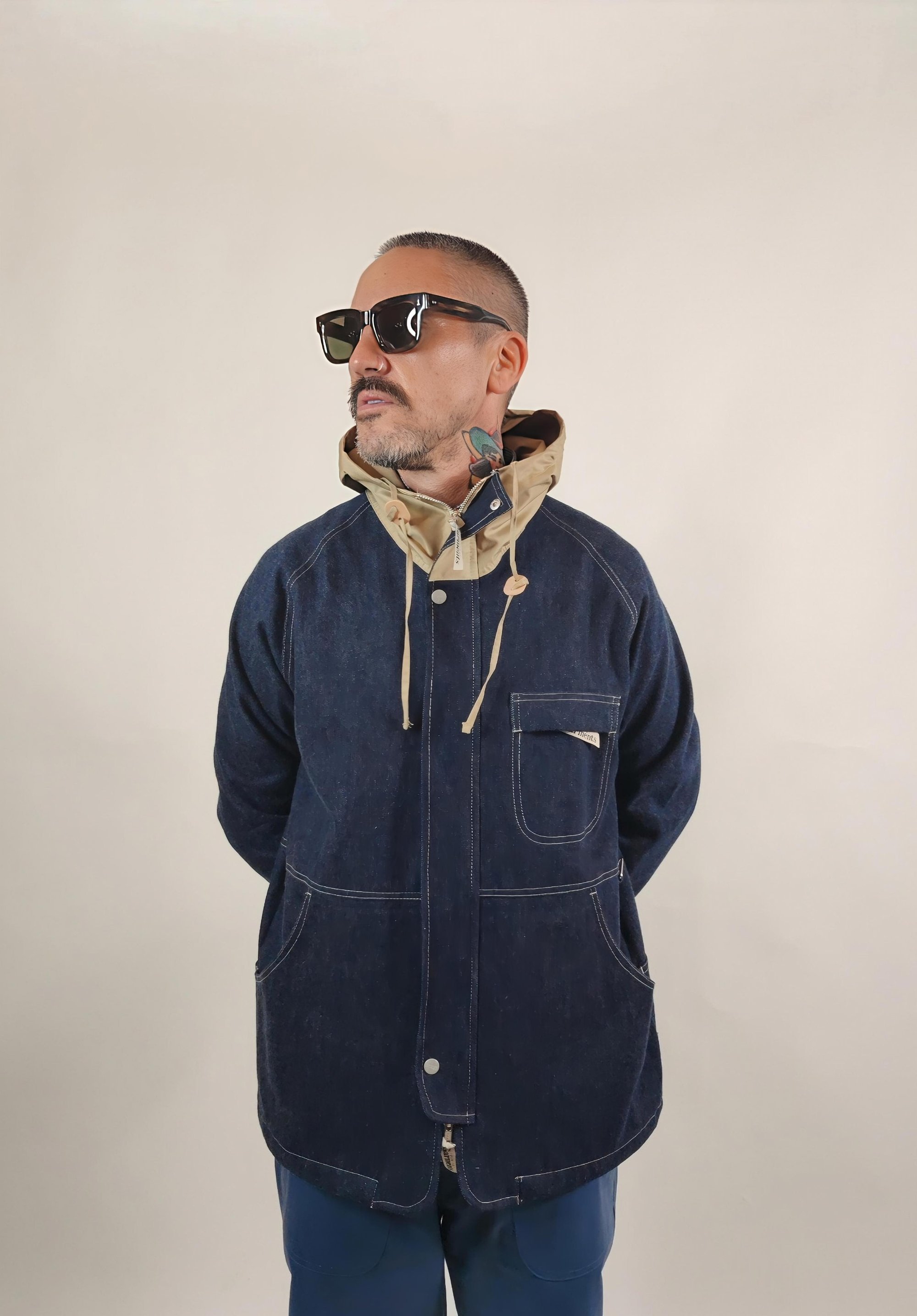 The overall appearance is both functional for the outdoors and stylish in a way that harkens back to traditional hunting fashion with a retro, denim-centric twist.