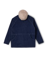 Denim fabric ....3 front pockets and 1 large back pockets Removable neck flap , EG engraved Buttons and EG zip Pulls.