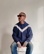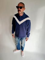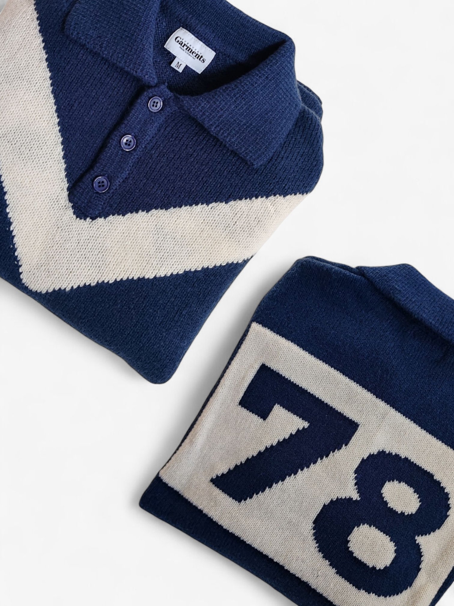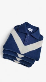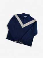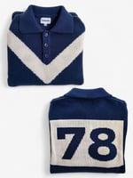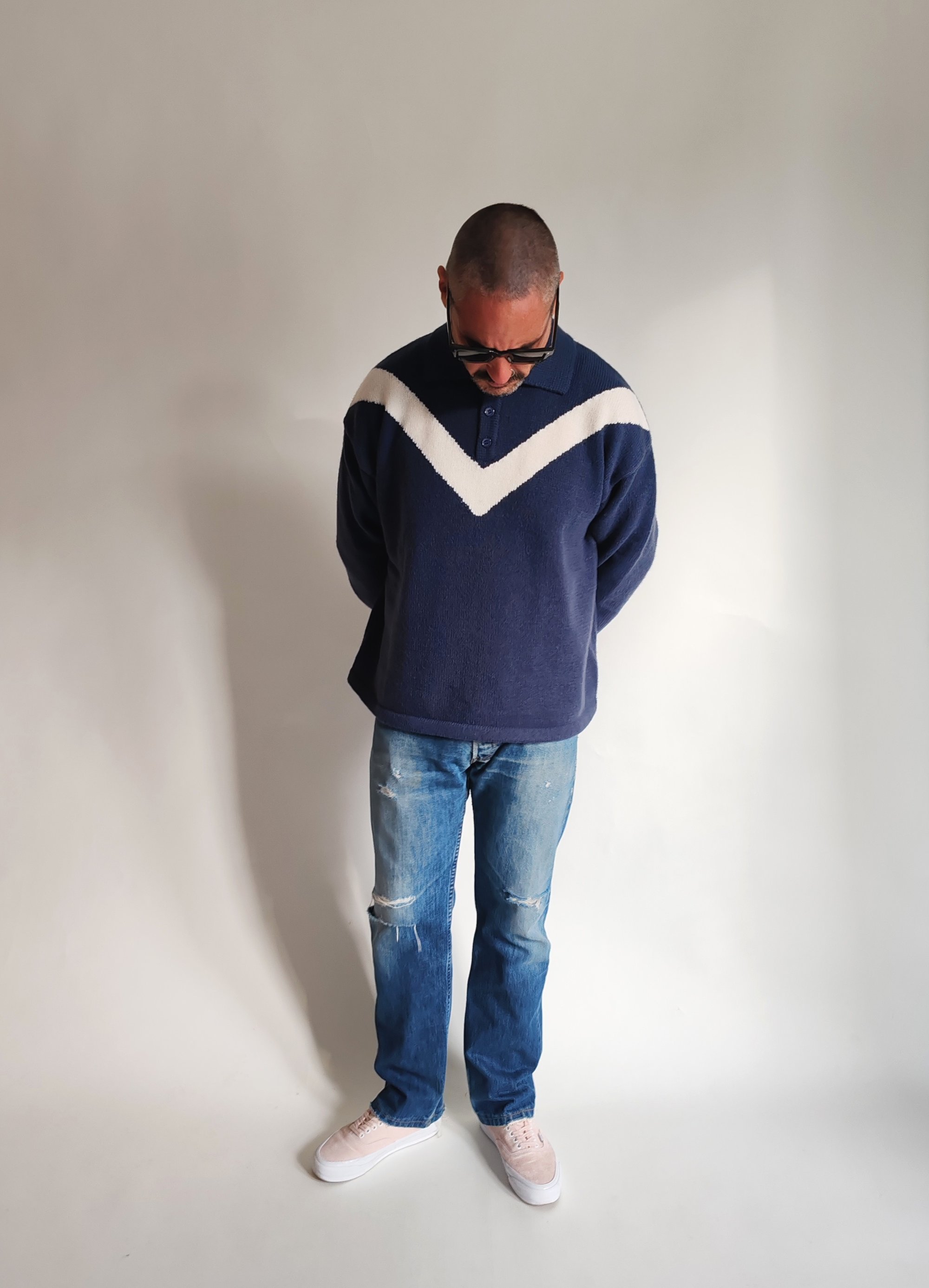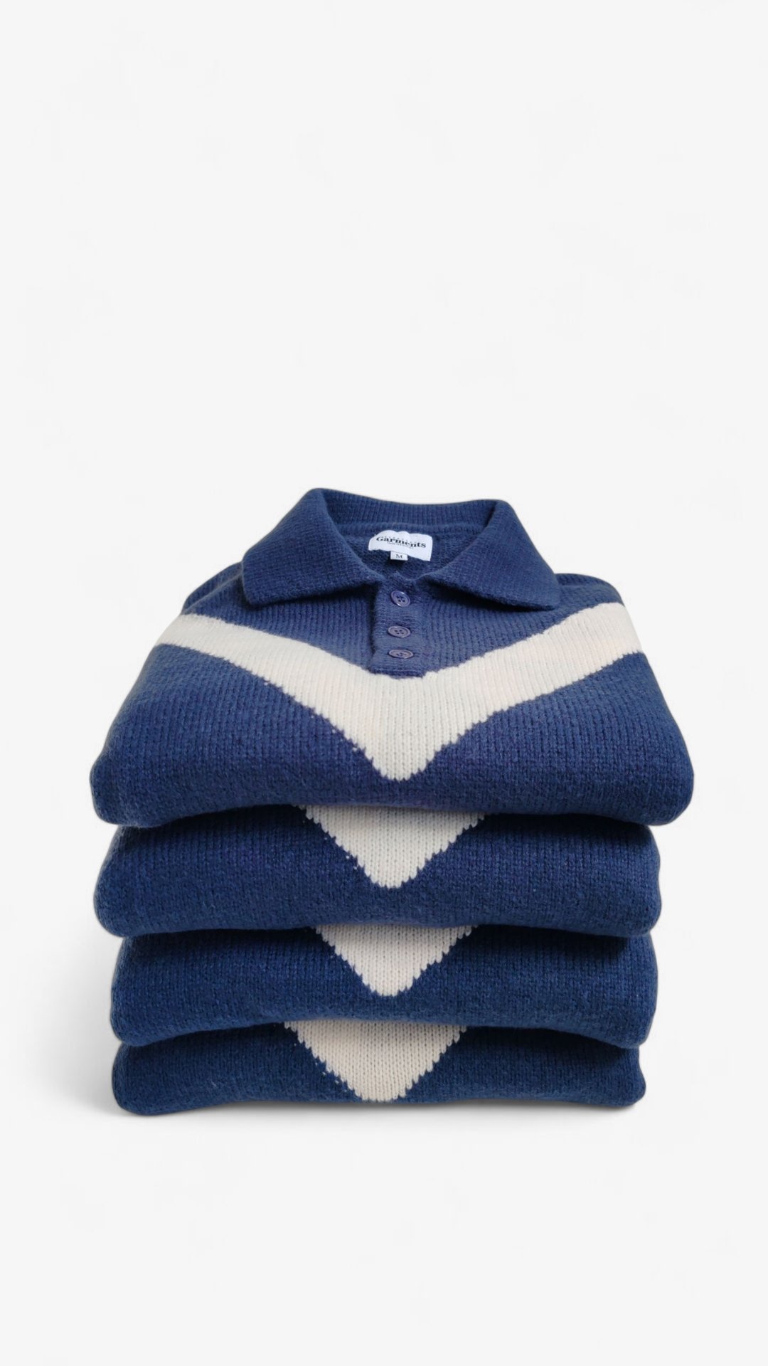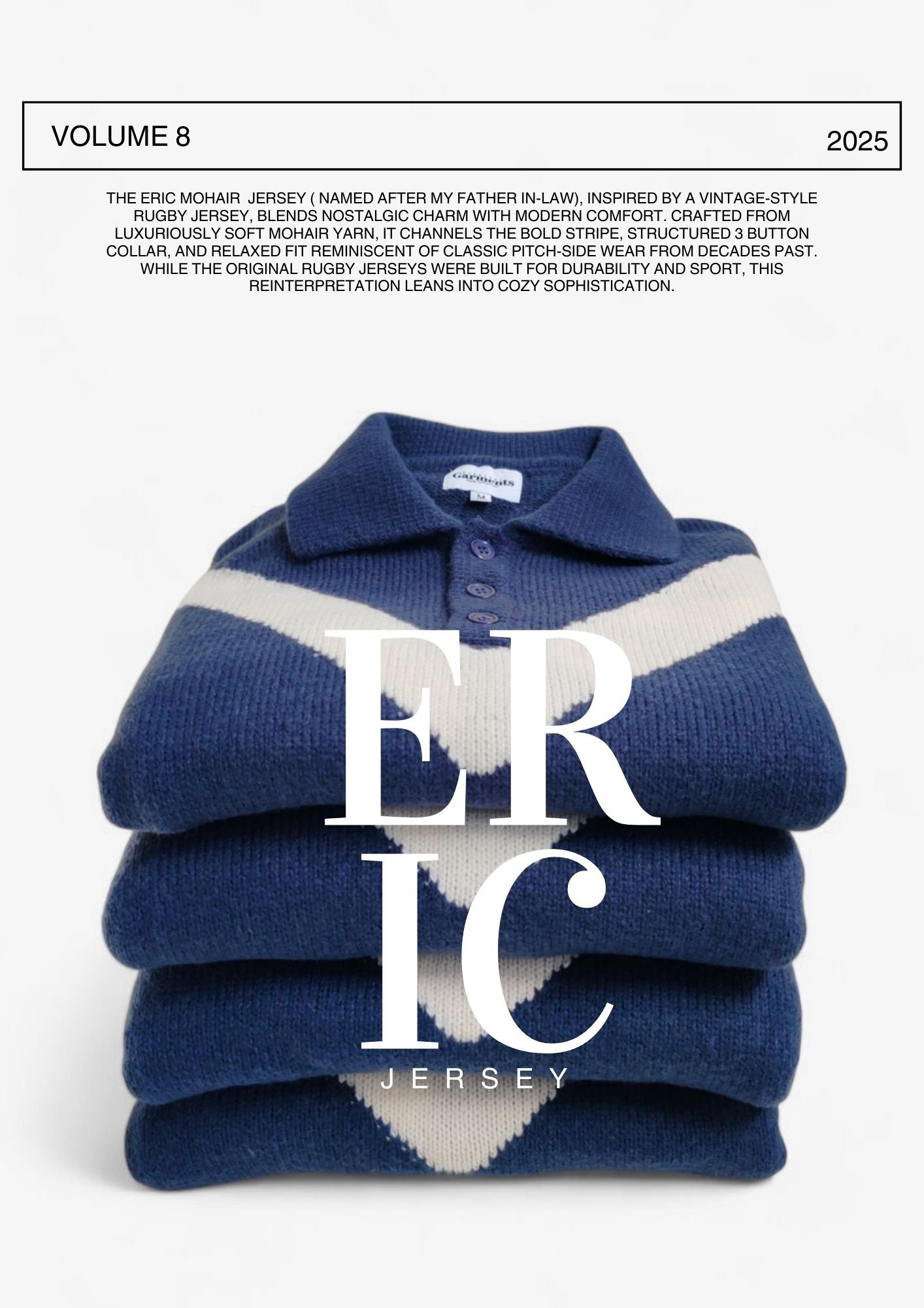 The Eric Mohair jersey ( Named after my father in-law), inspired by a vintage-style rugby jersey, blends nostalgic charm with modern comfort. Crafted from luxuriously soft mohair yarn, it channels the bold stripe, structured 3 button collar, and relaxed fit reminiscent of classic pitch-side wear from decades past. While the original rugby jerseys were built for durability and sport, this reinterpretation leans into cozy sophistication,