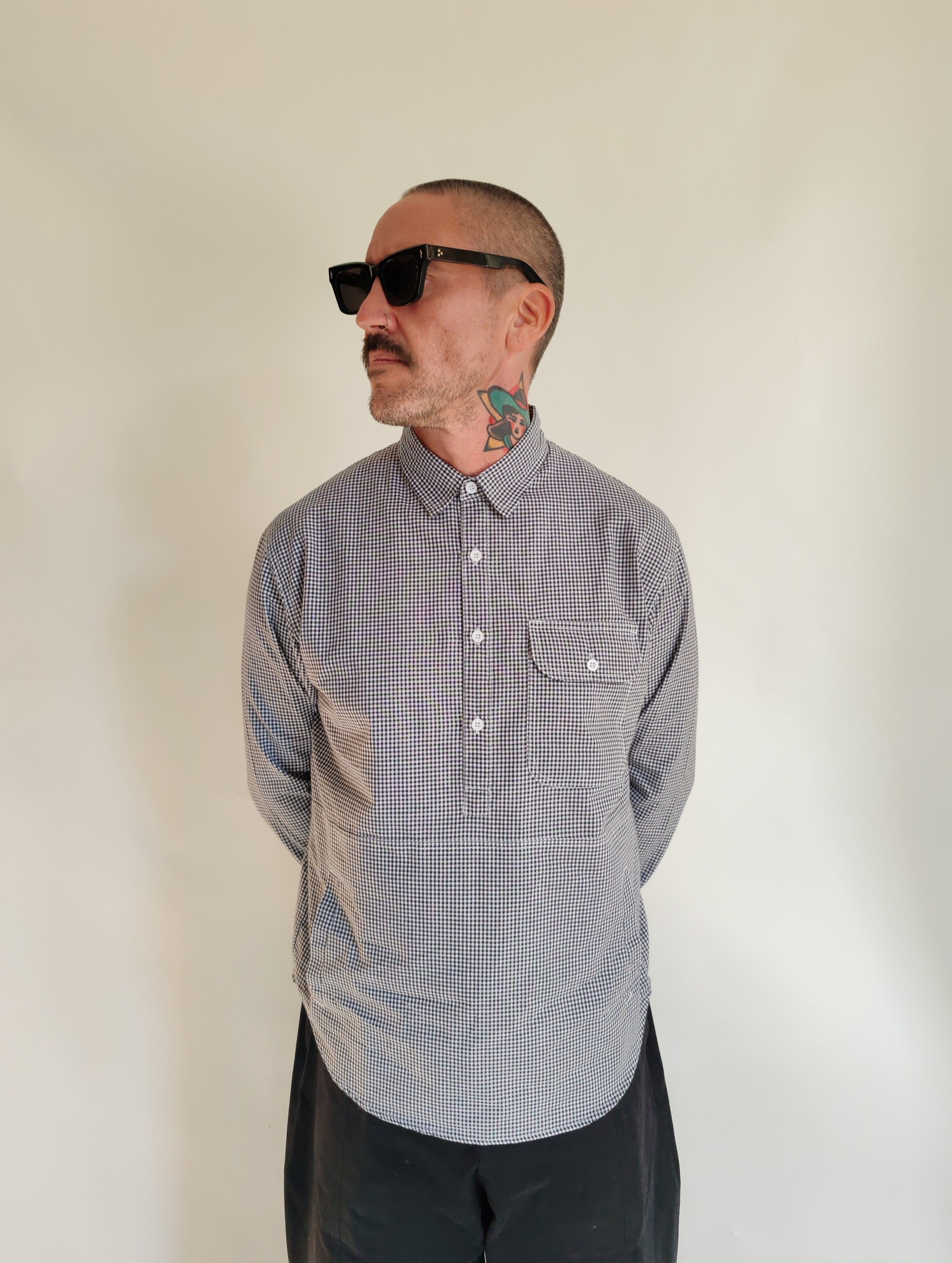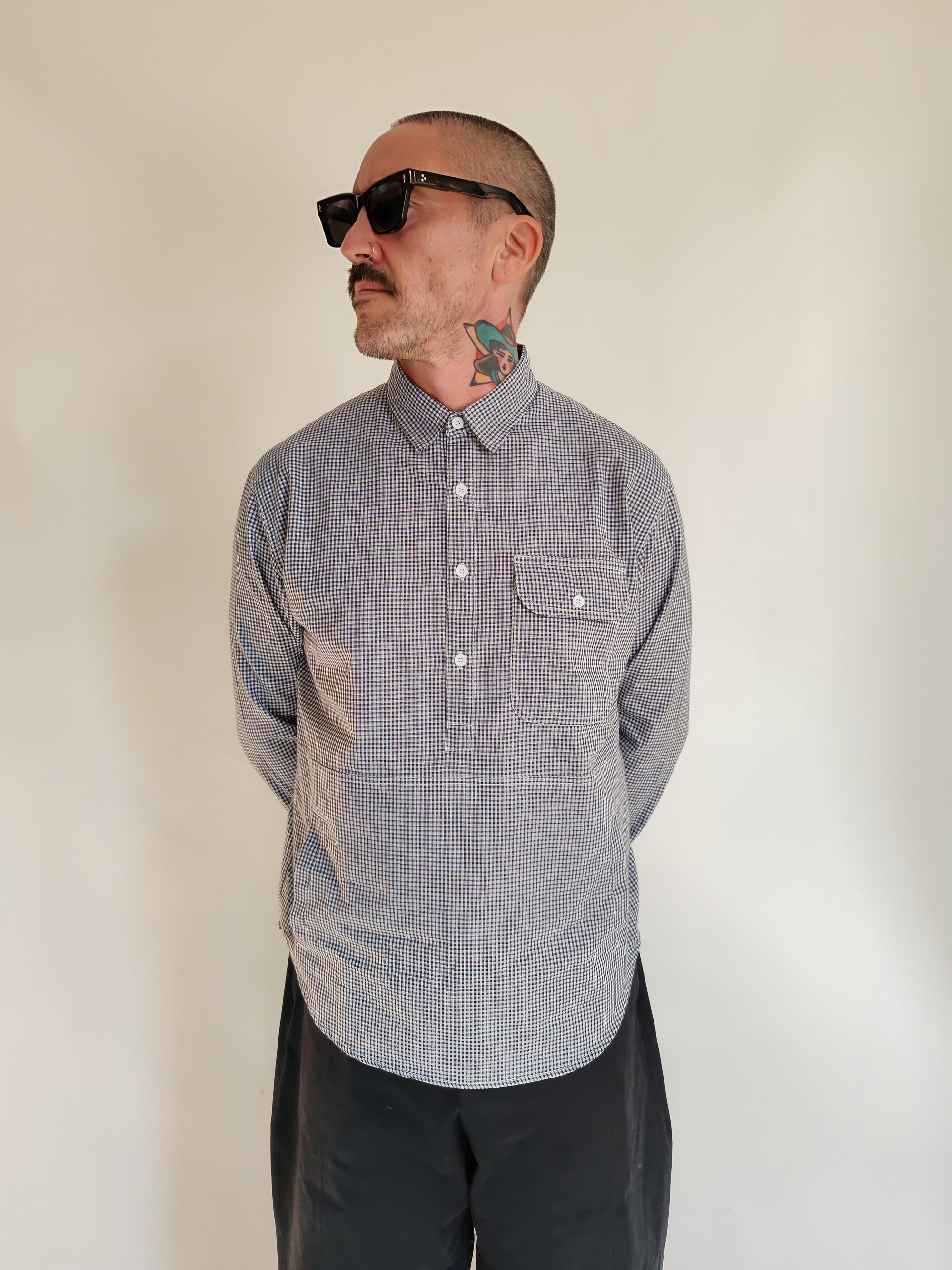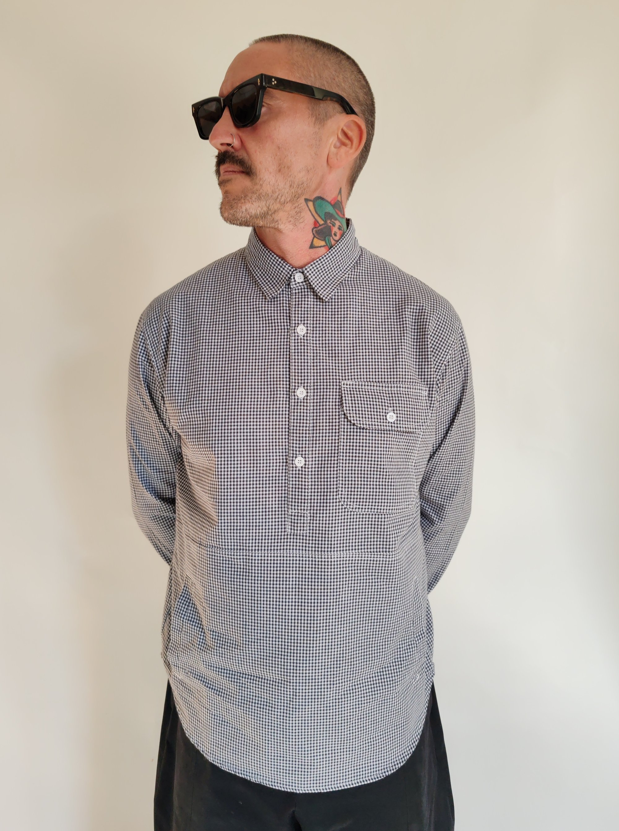 This new gingham shirt is designed in a classic check pattern and cut in a casual overhead style with a four-button placket at the neckline. Blending utility with comfort, it features a standout oversized pouch pocket at the front, complete with side access for a relaxed feel. The combination of traditional gingham fabric with modern, functional details gives the shirt a versatile look that works both for layering and as a statement piece on its own.