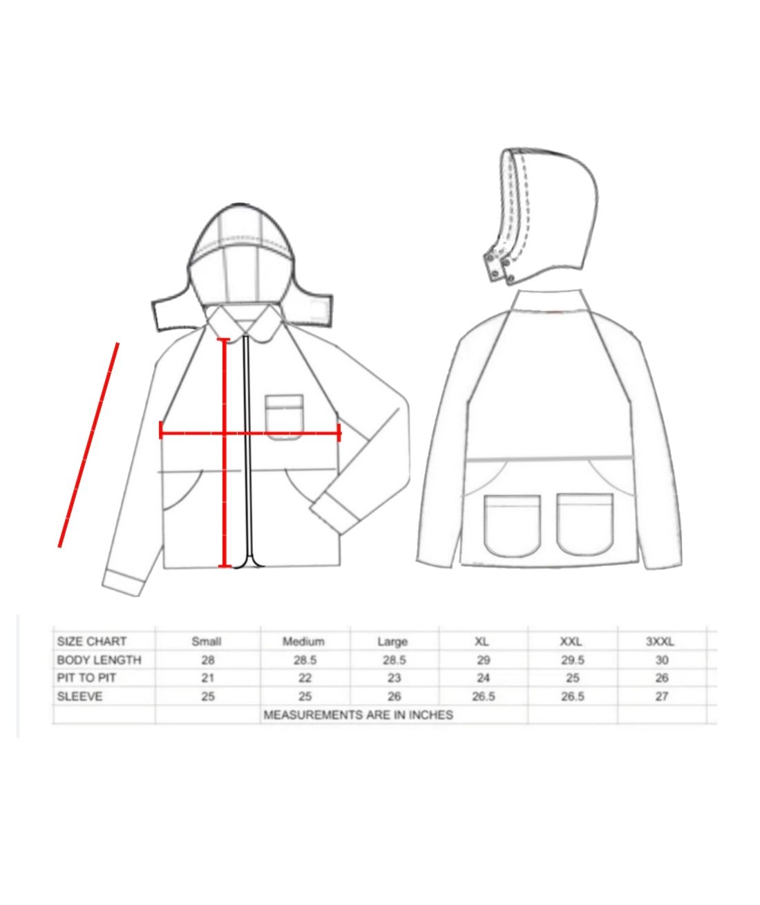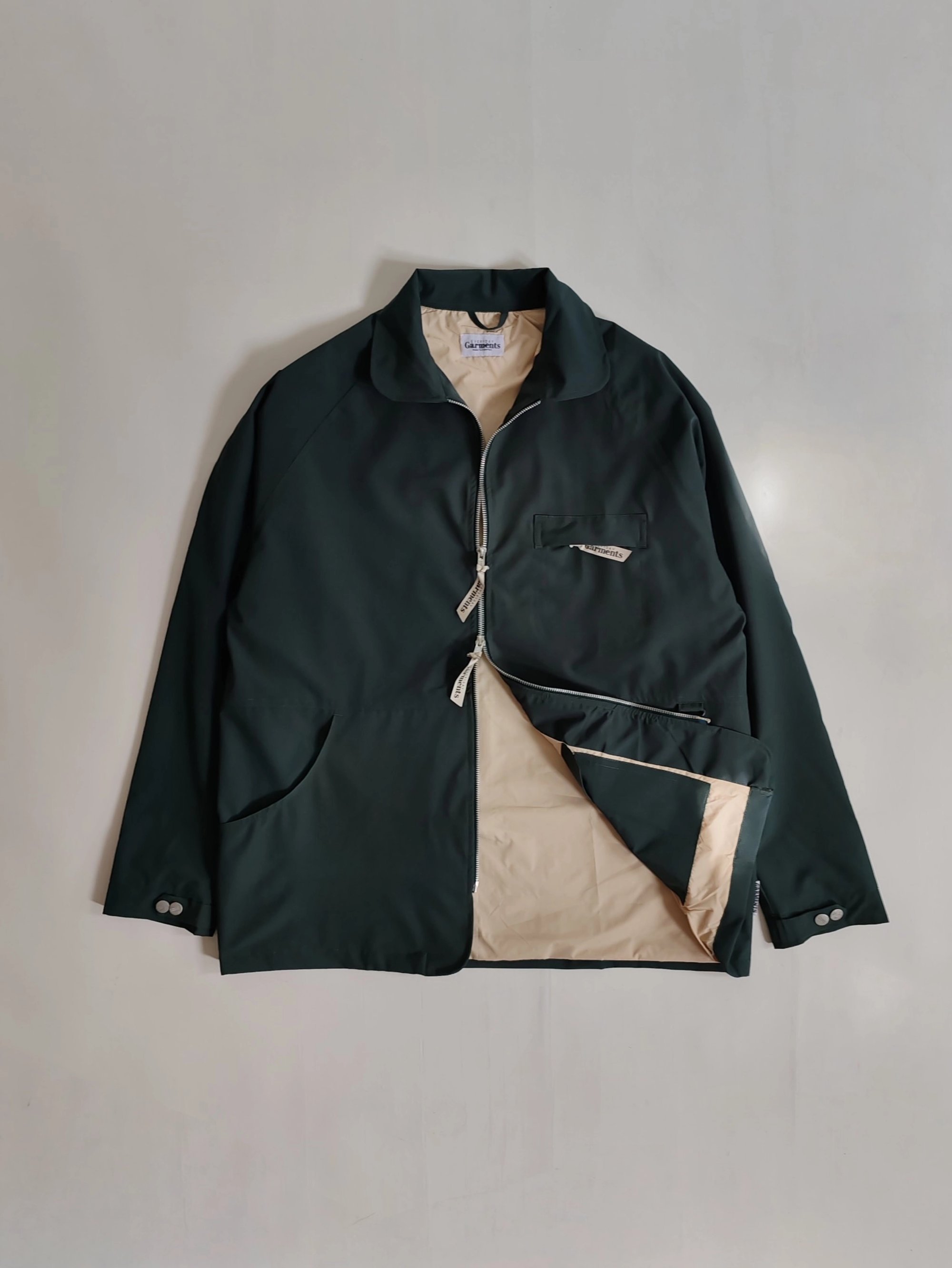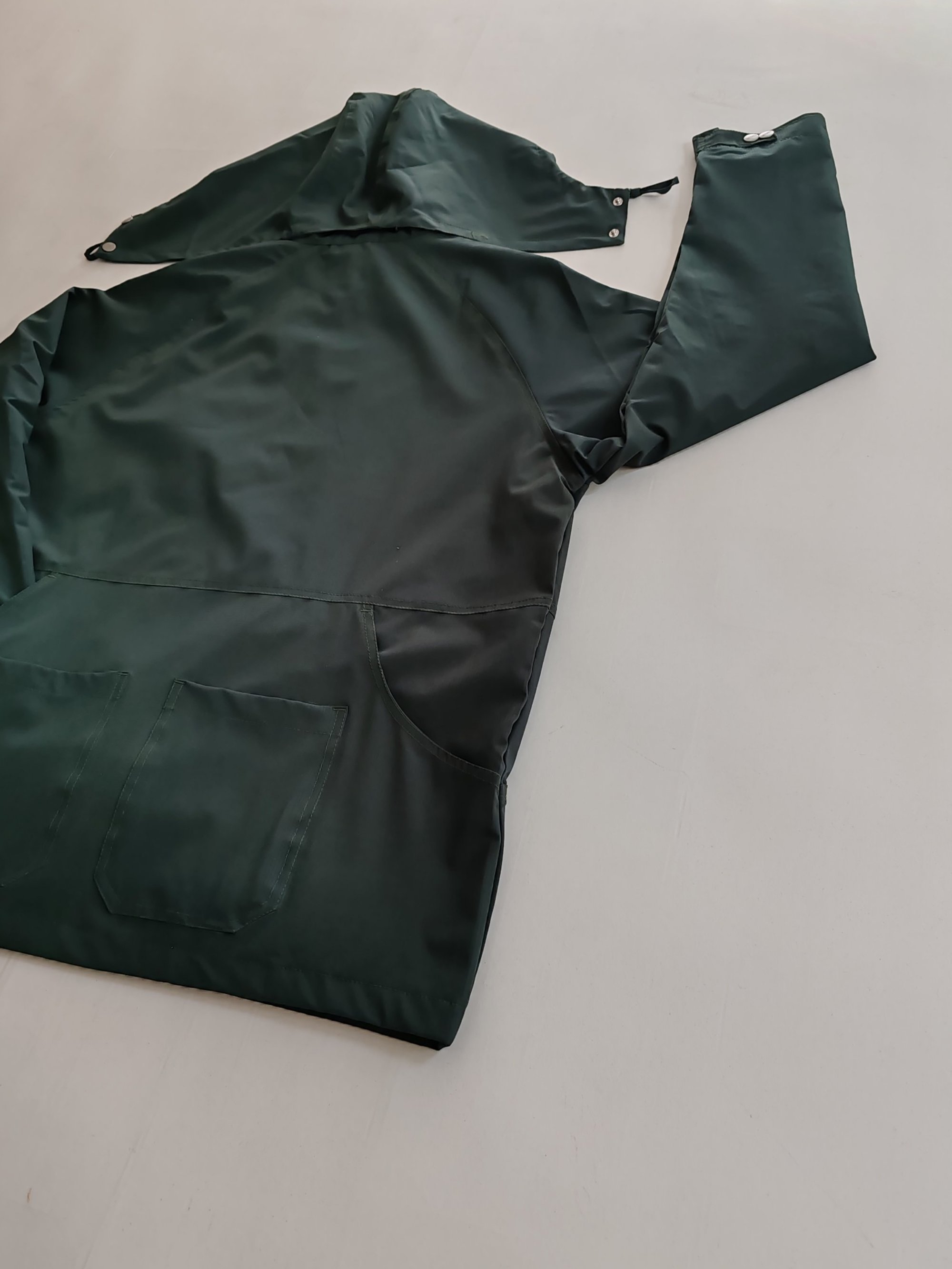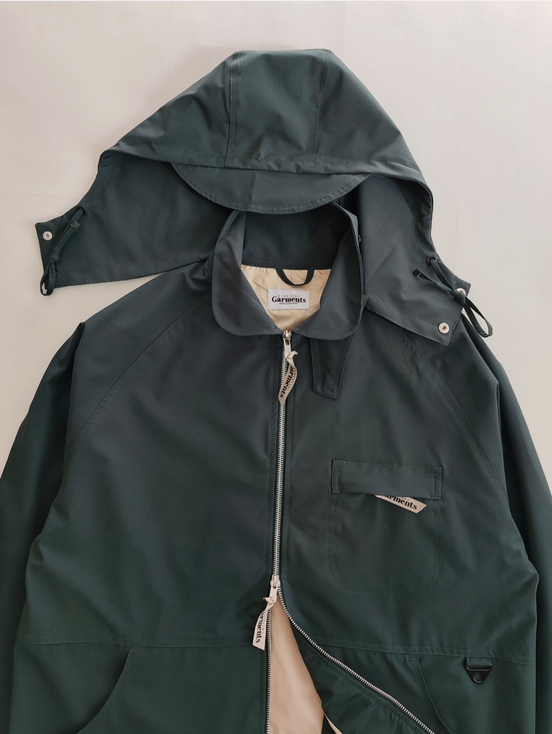Nylon Water Resistant micro Ripstop Fabric with curved Collars ....3 front pockets and 1 large with 2 centre pockets. Removable hood and neck flap , EG engraved Buttons and EG zip Pulls.